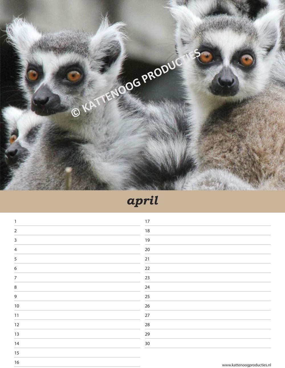 Grote, fraaie kalender met prachtige dierenfoto's met volop ruimte voor alle verjaardagen van je familie, vrienden en kennissen. Ook ruim voldoende ruimte als er meerdere mensen tegelijk op dezelfde dag jarig zijn. Op deze pagina zie je 3 voorbeeldpagina's.